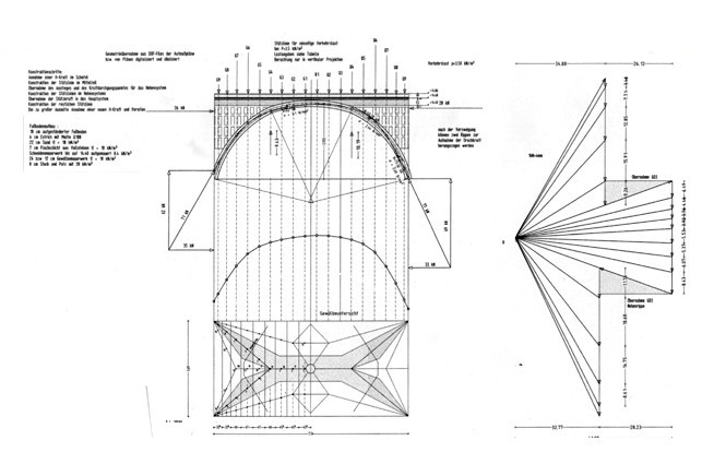 Darstellung der Tragfähigkeit der Gewölbe mittels der Stützlinienmethode zur Ermittlung der maximalen Verkehrslast. Nur durch iterative Schritte konnte der unbestimmte Kraftfluss in den verzweigten Netzrippen erfasst werden. Das traditionelle Stützlinienverfahren wurde mit modernster CAD-Technik erweitert. Der Nachweis bis zu einer einseitigen Verkehrslast von 3,5 kN/m² gelang bei gleichzeitigem Einbringen einer zusätzlichen Sandschicht (höhere Gleichlast).